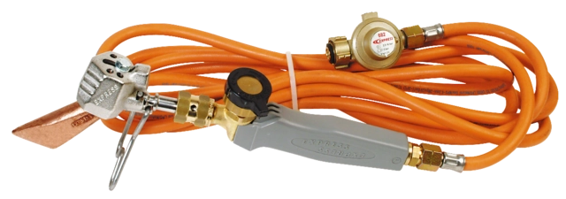 Ensemble pour couvreur comprenant une lance avec panne Réf. 4678, un manche Réf. 602, un tuyau de 4,75 m Réf. 963/5 ainsi qu’un détendeur 2 bar Réf. 682.